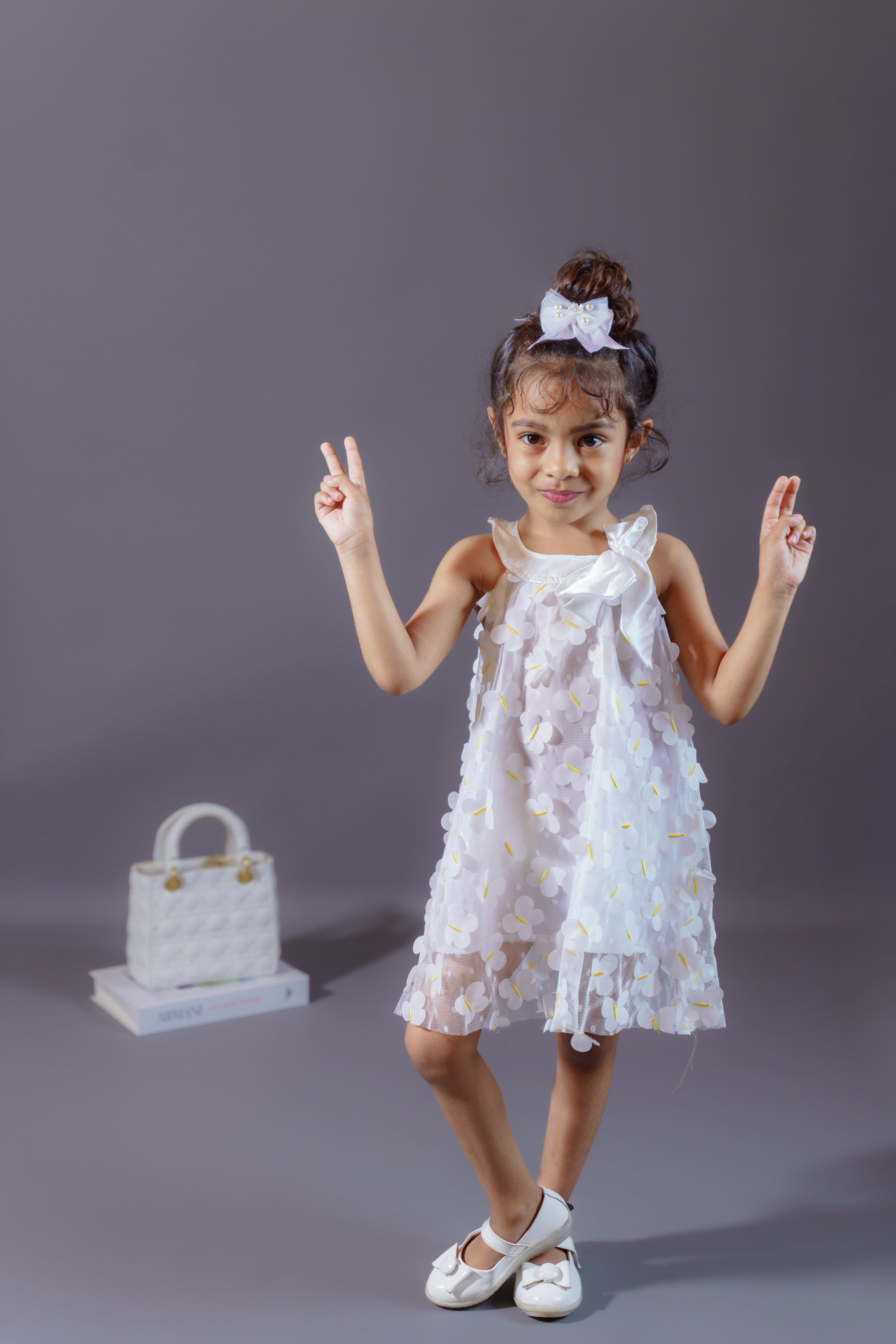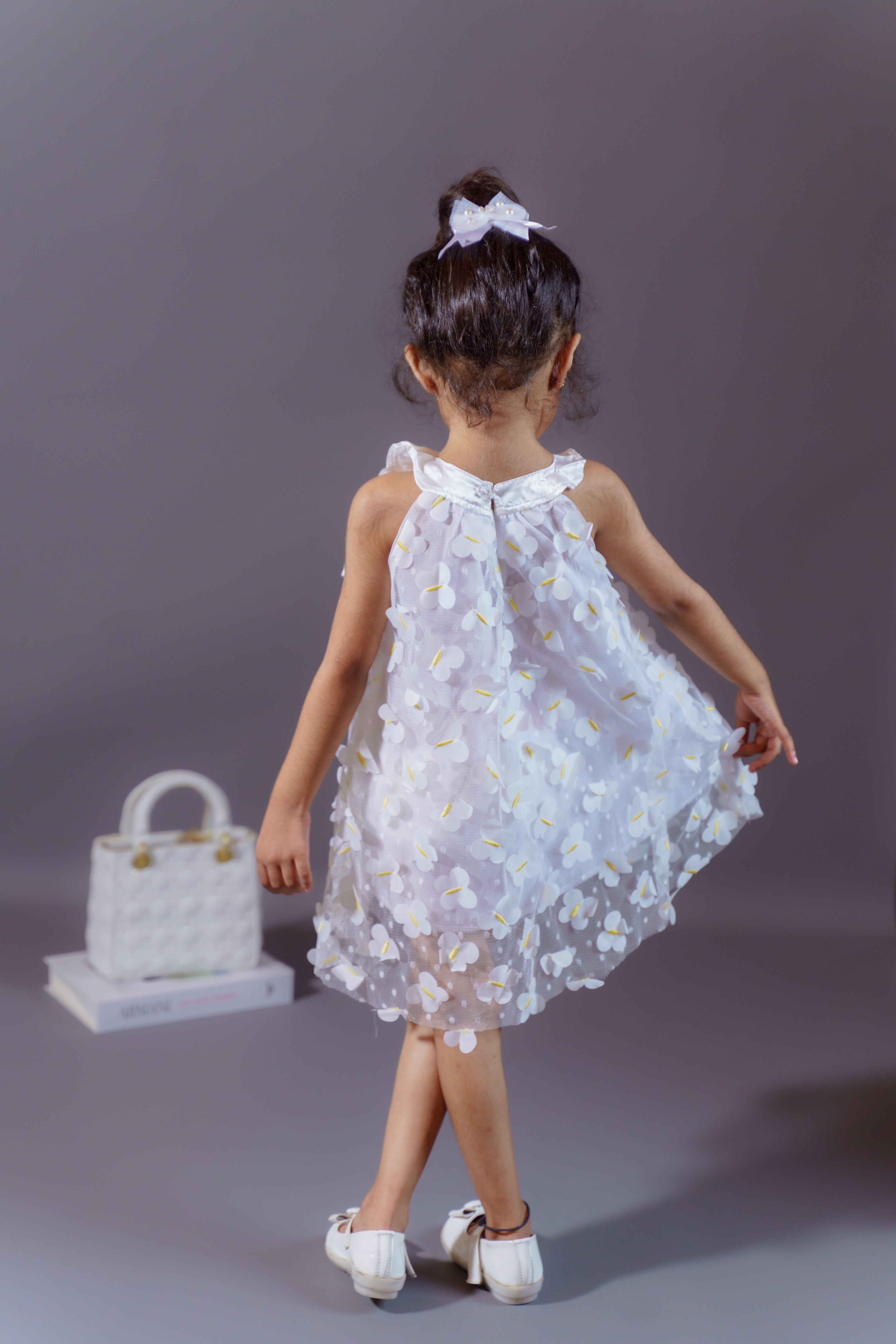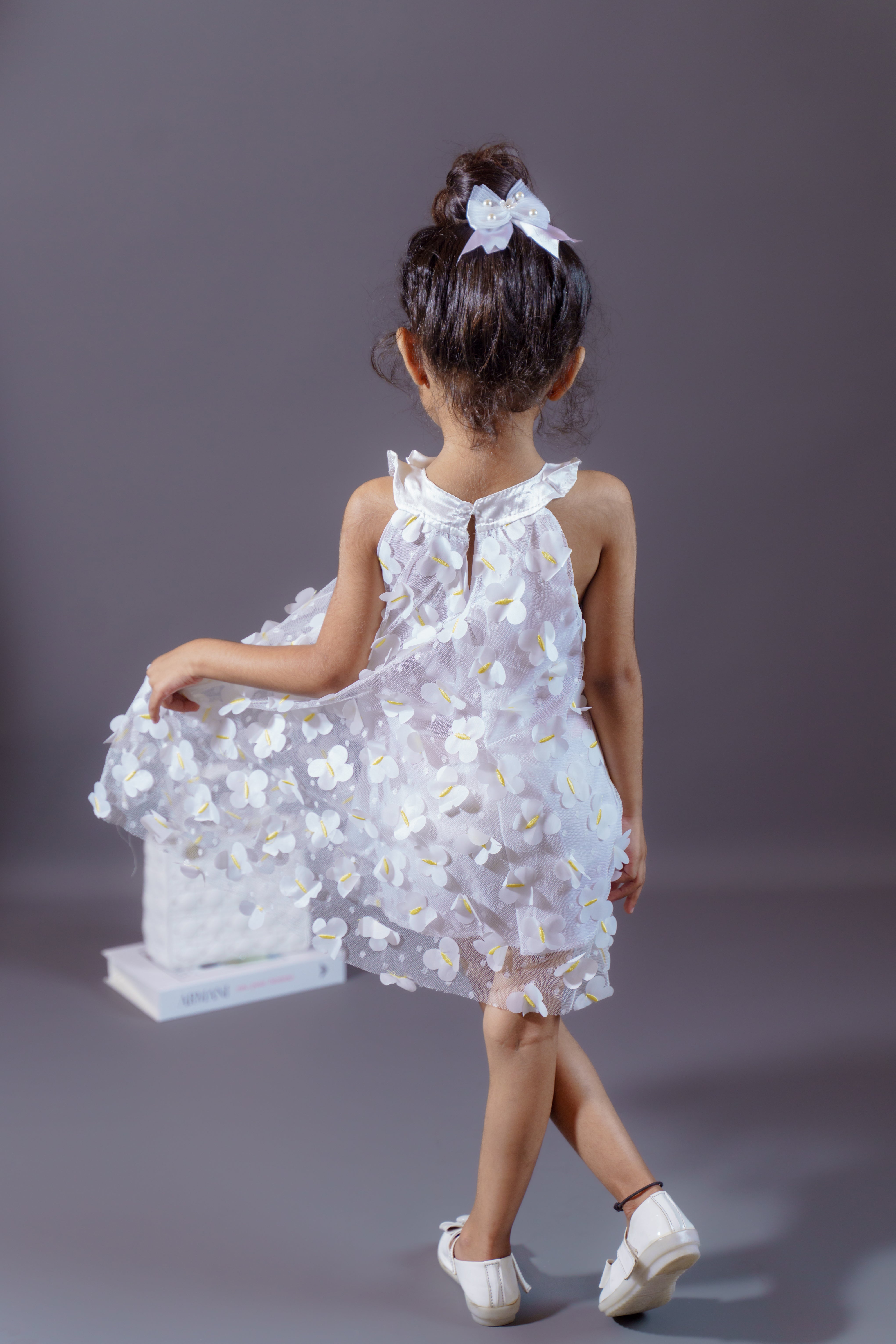 Bring a fairytale to life with this enchanting butterfly dress. Designed in soft polyester, it features a sheer overlay sprinkled with 3D butterflies that dance as your little one twirls. The neckline bow completes the look with playful elegance, making this dress a statement piece for every special celebration. Comfortable and magical, it’s a dress that lets her feel like she’s walking with wings.