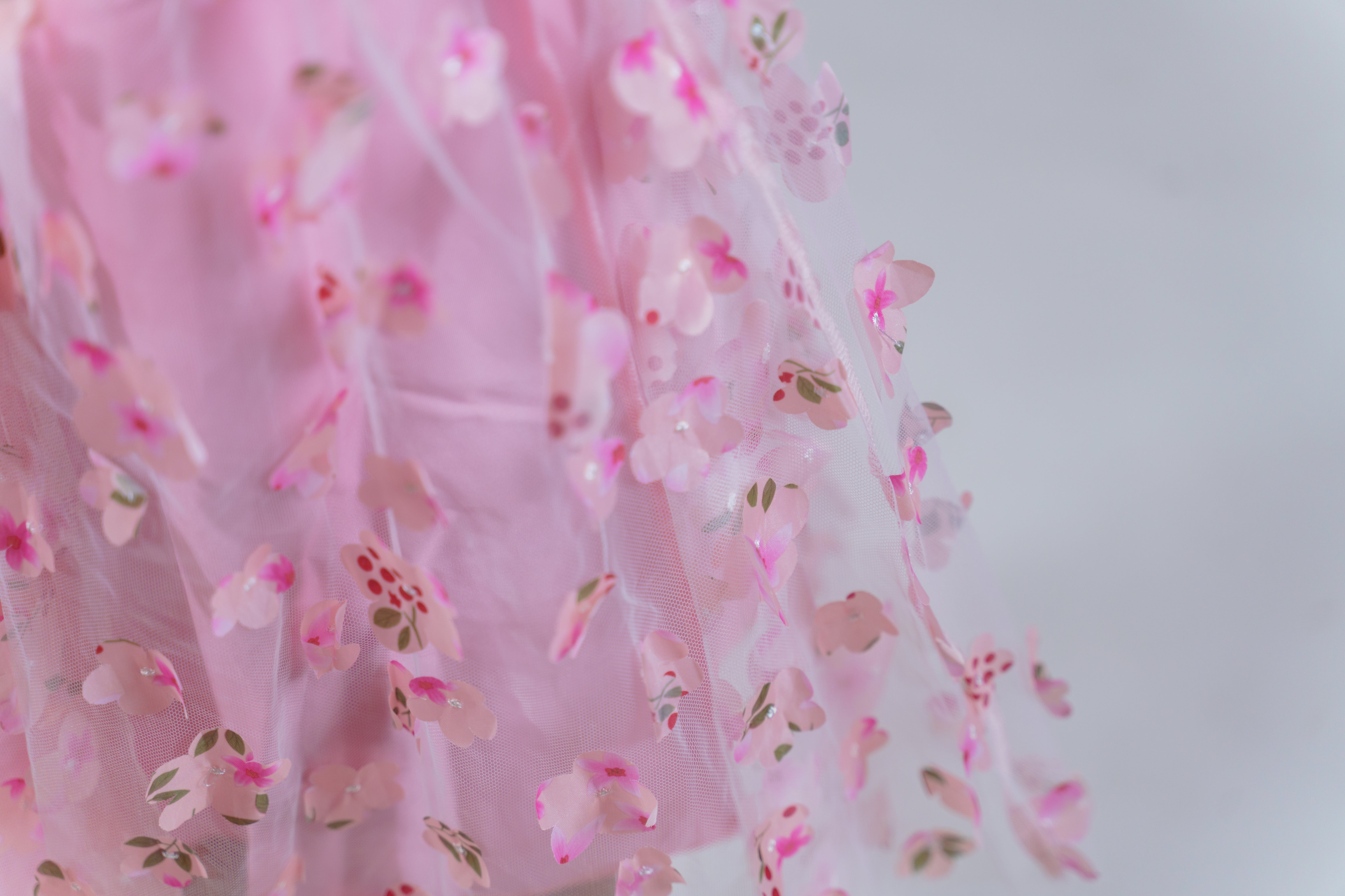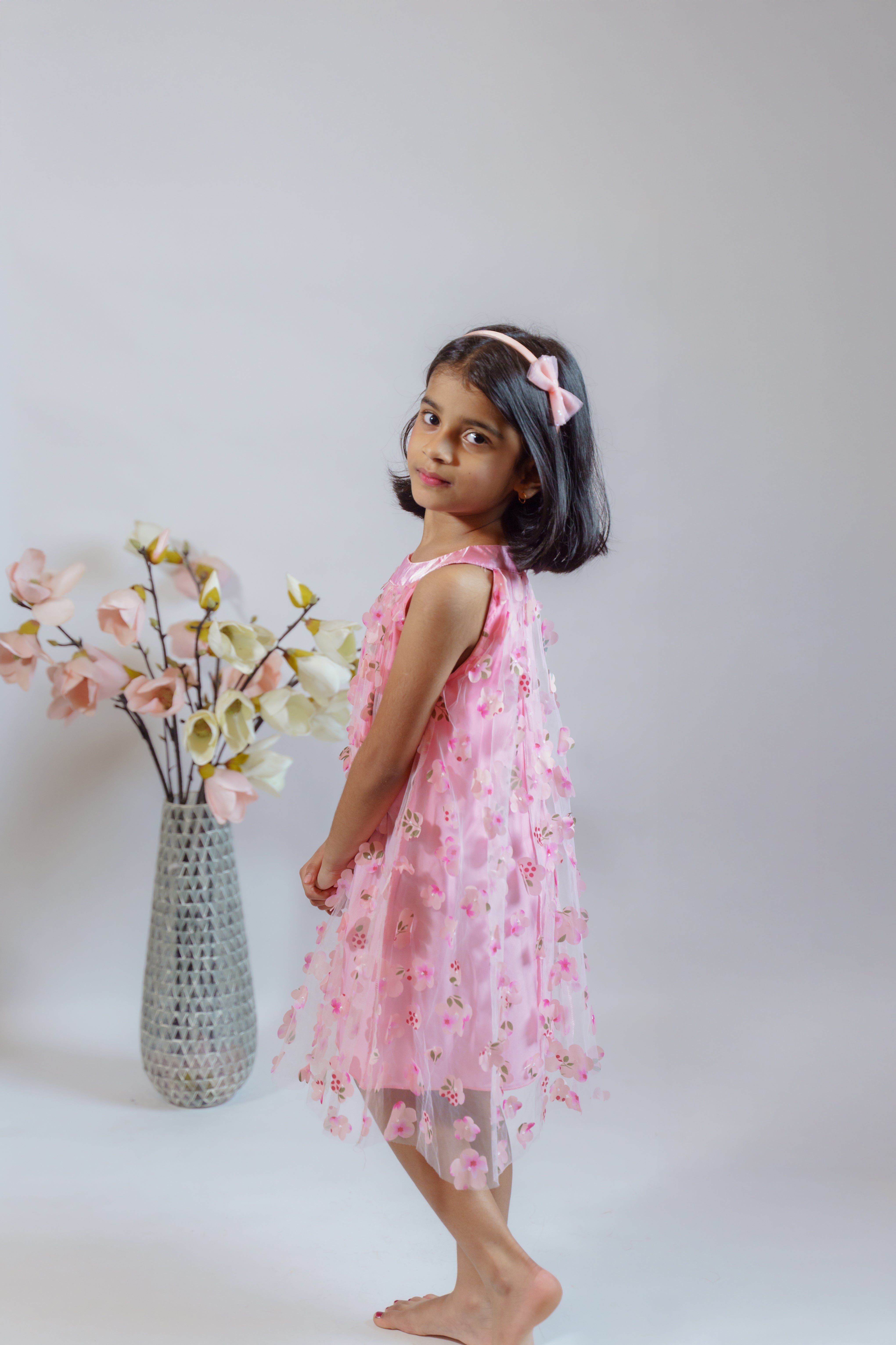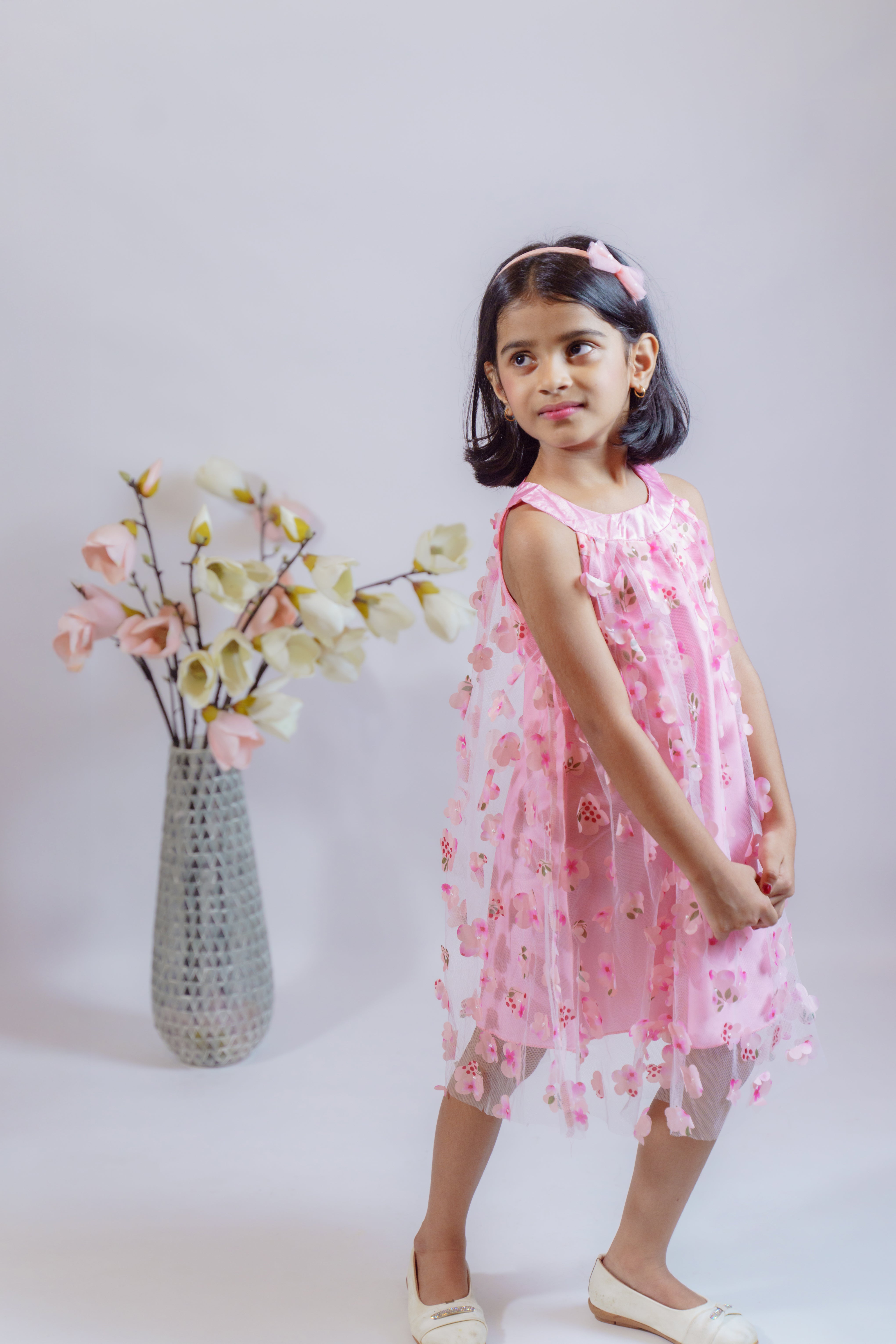 A dress that captures the magic of blossom this enchanting piece is designed with a soft satin lining layered with delicate net fabric for a dreamy silhouette. The highlight of the dress is its 3D cherry blossom appliqué flowers, carefully scattered across the sheer overlay, creating a blooming garden effect with every twirl.