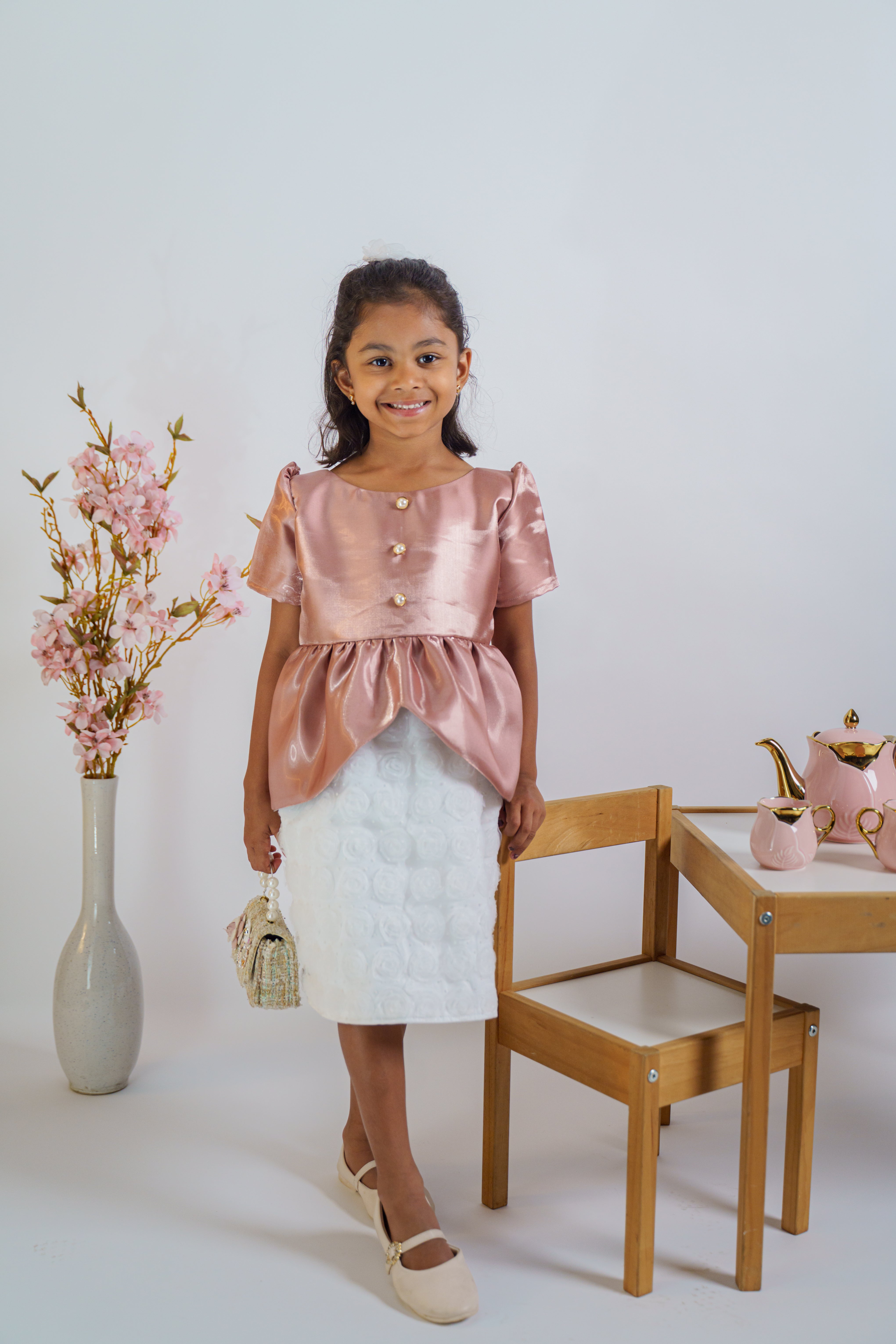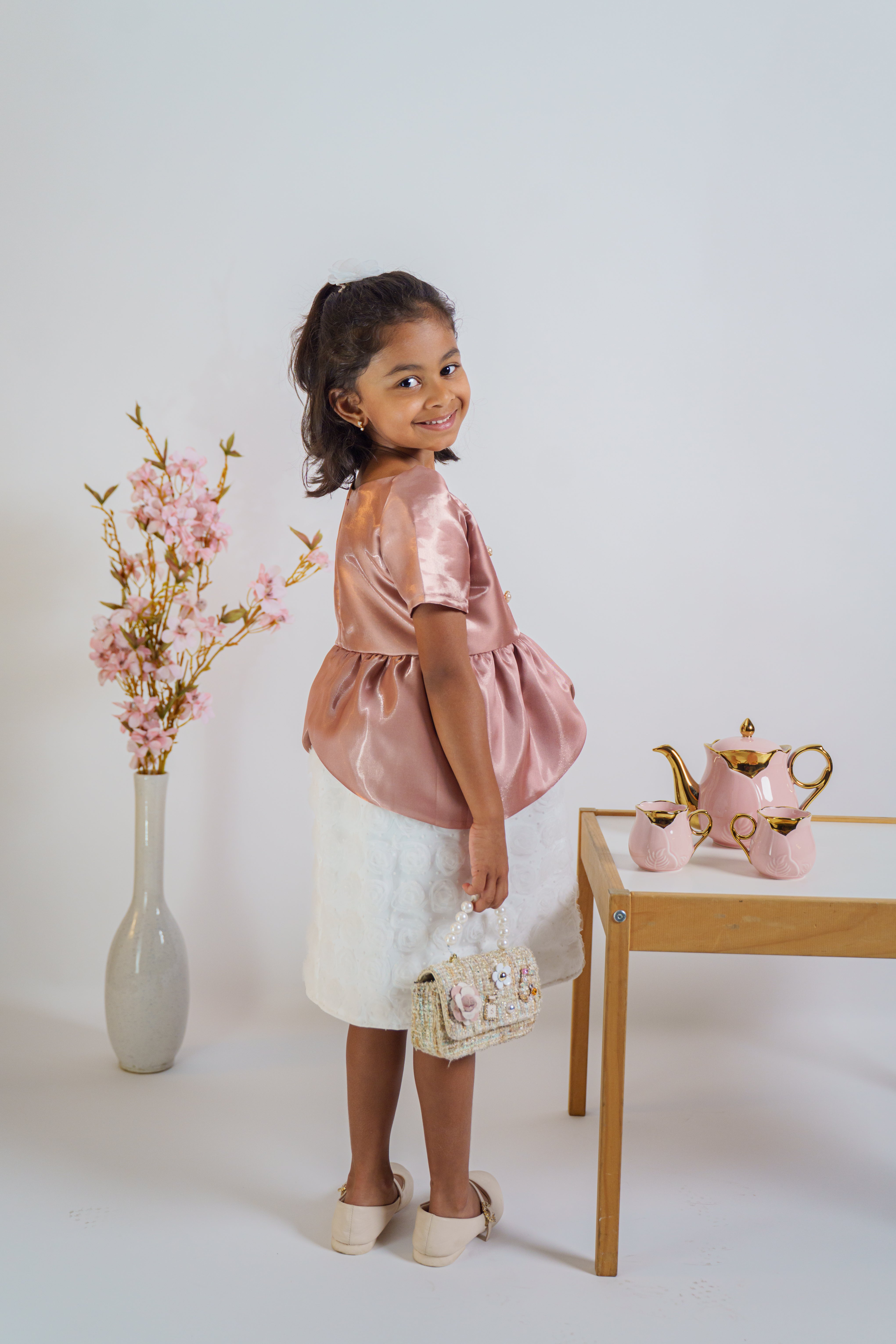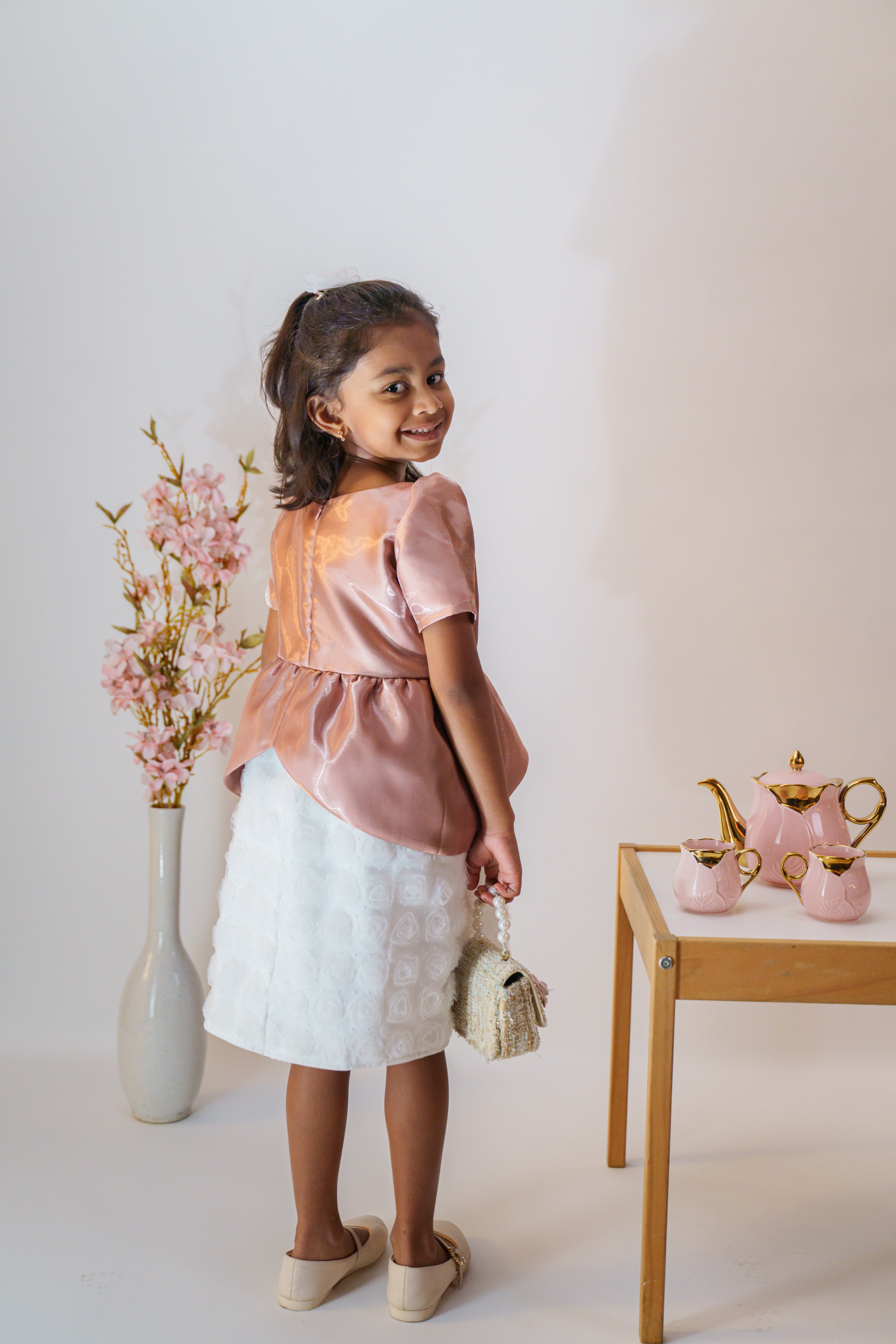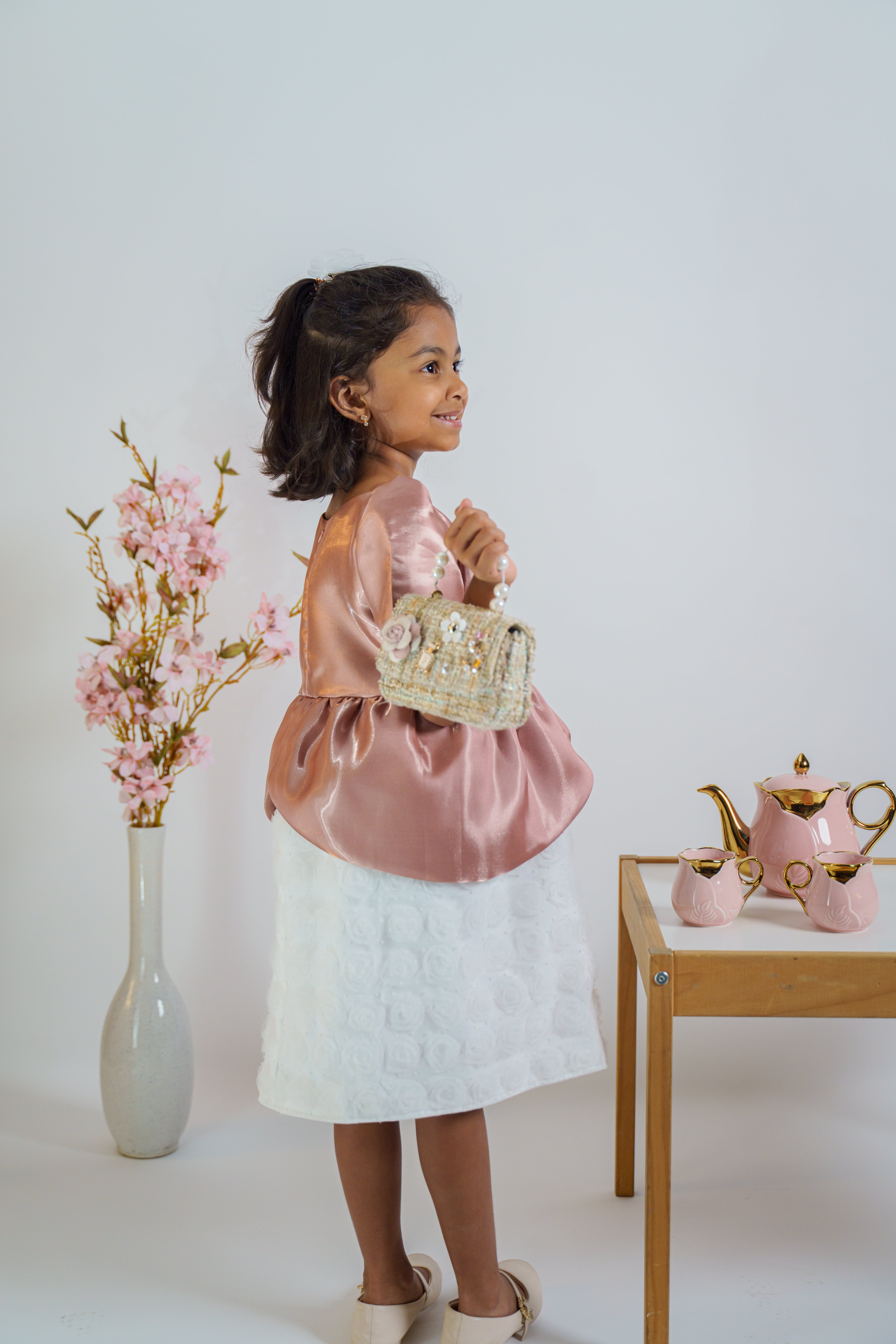 Designed for your little princess. This stunning dress combines the luxurious feel of silk satin with the ethereal beauty of net. The sweet short puffed sleeves adds a touch of whimsical charm.
