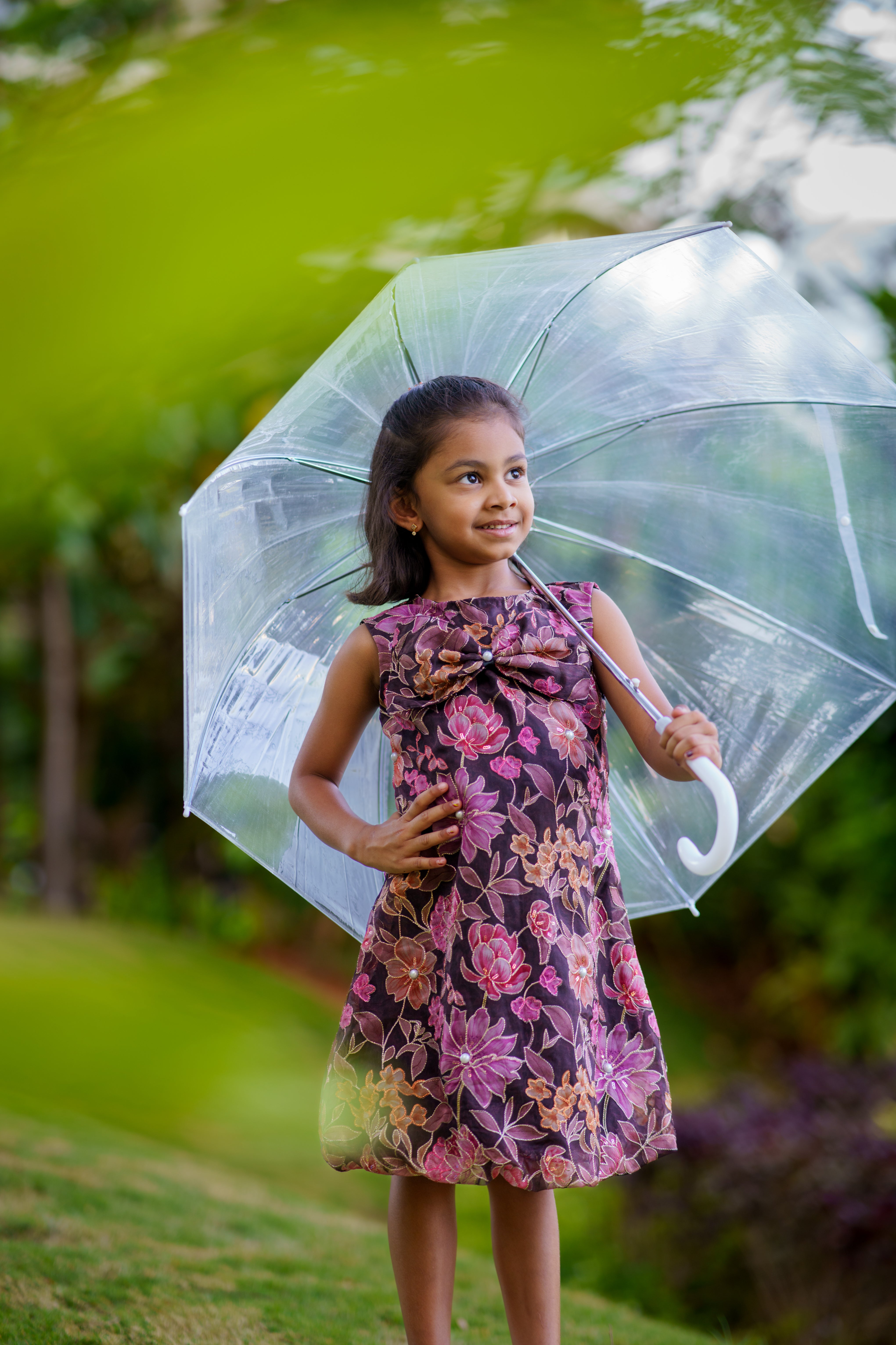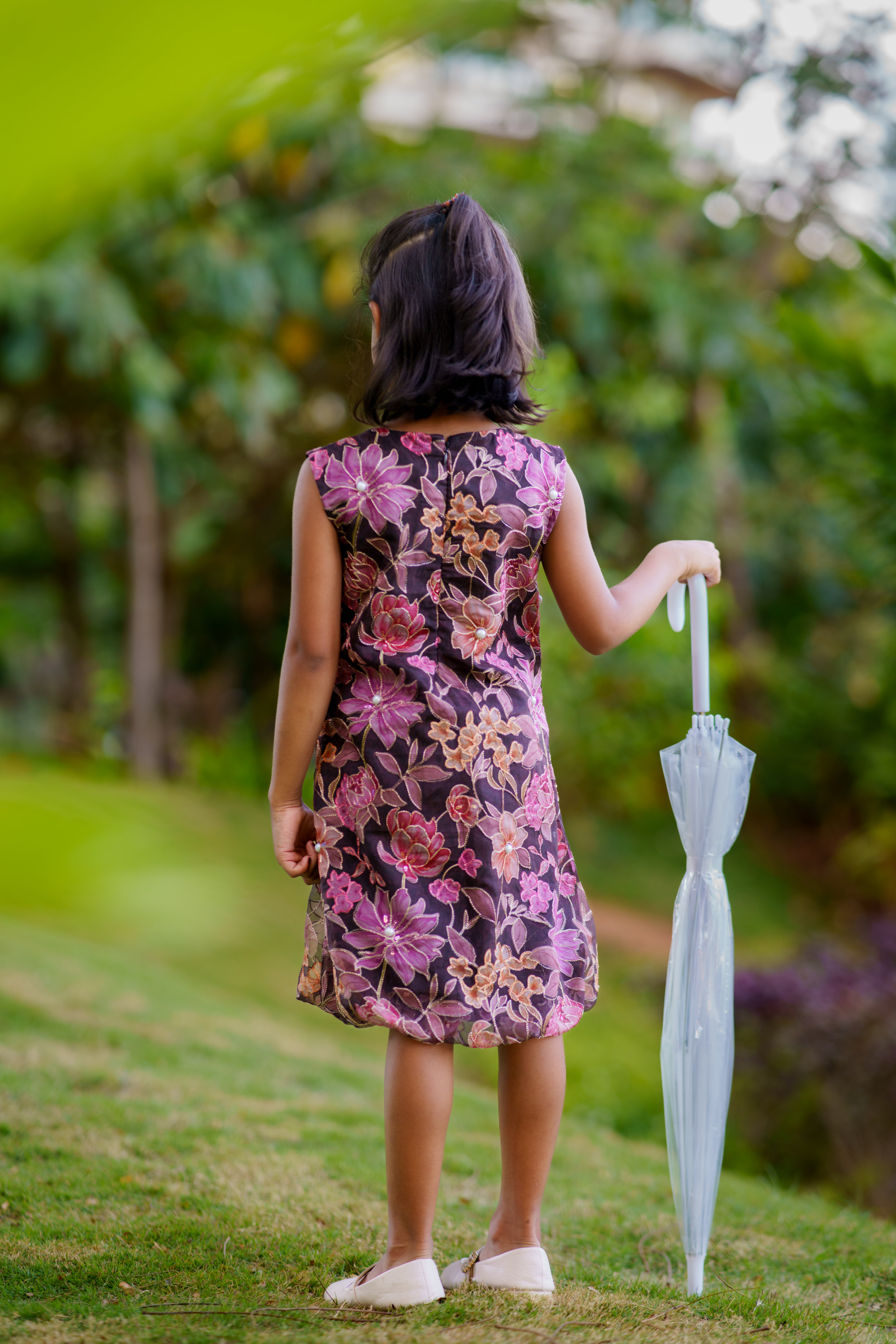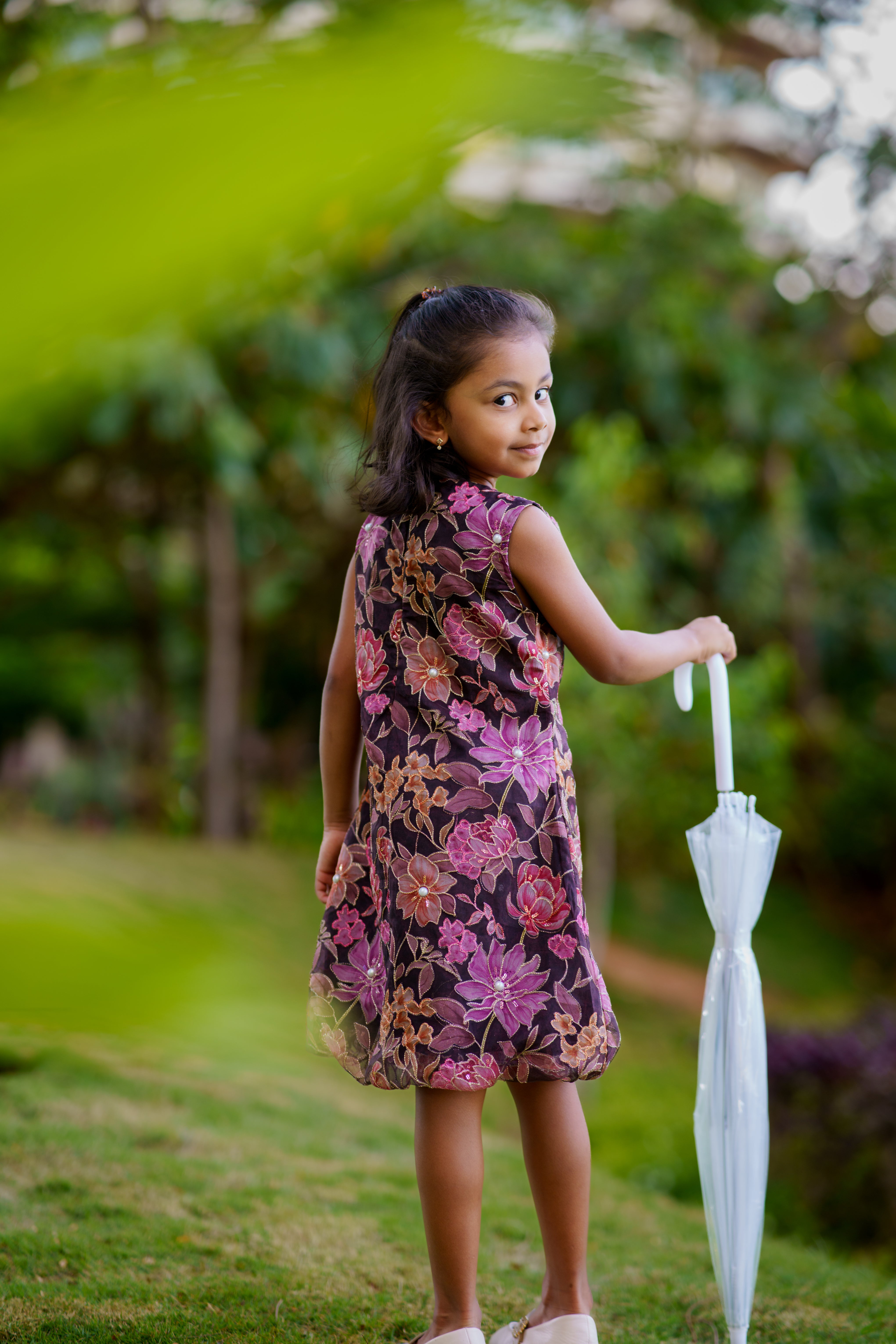 The perfect blend of comfort and style. This A-line balloon dress with a round neck, offers a flattering silhouette in printed polyester with an American crepe lining, enhanced by pearls and a central bow.