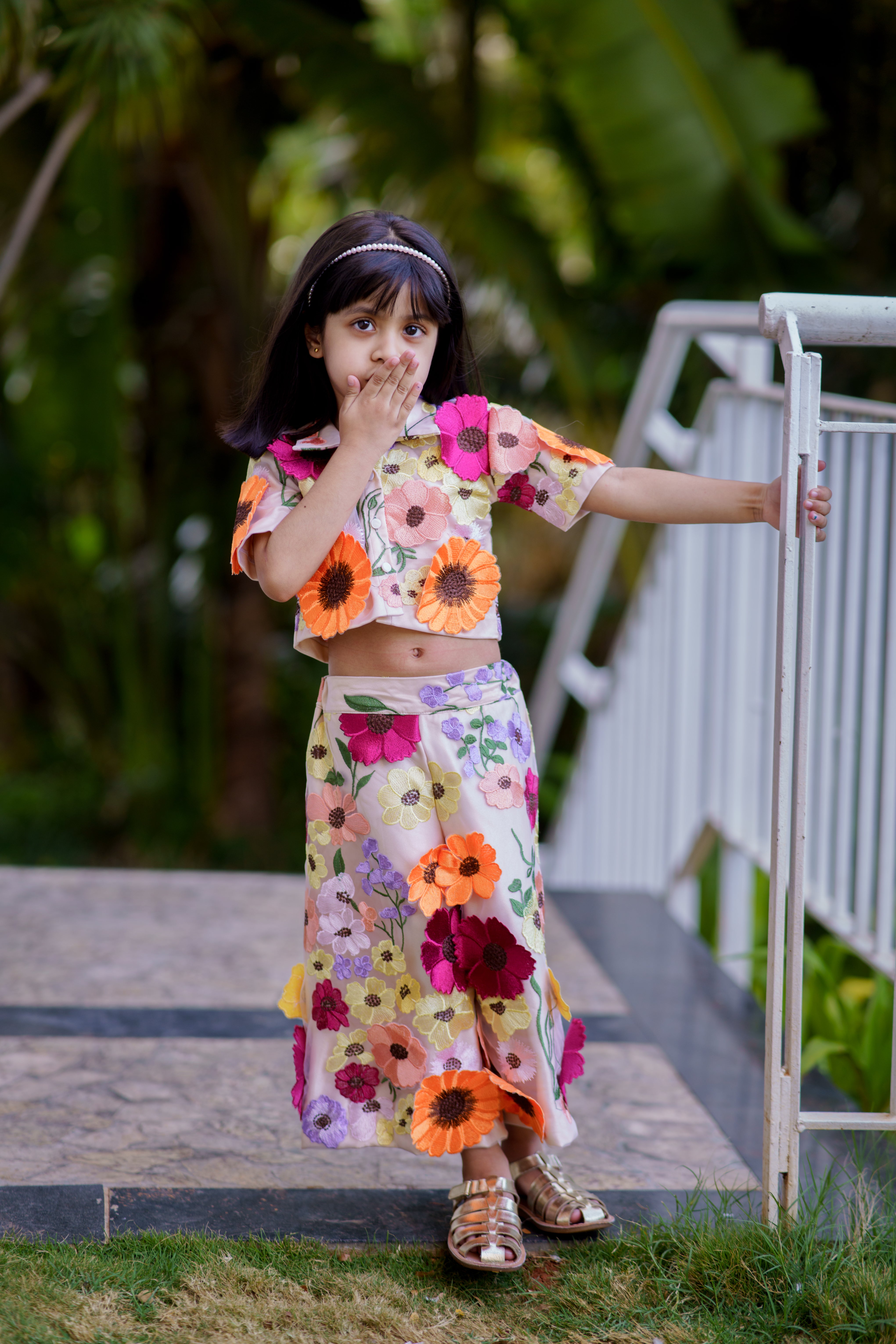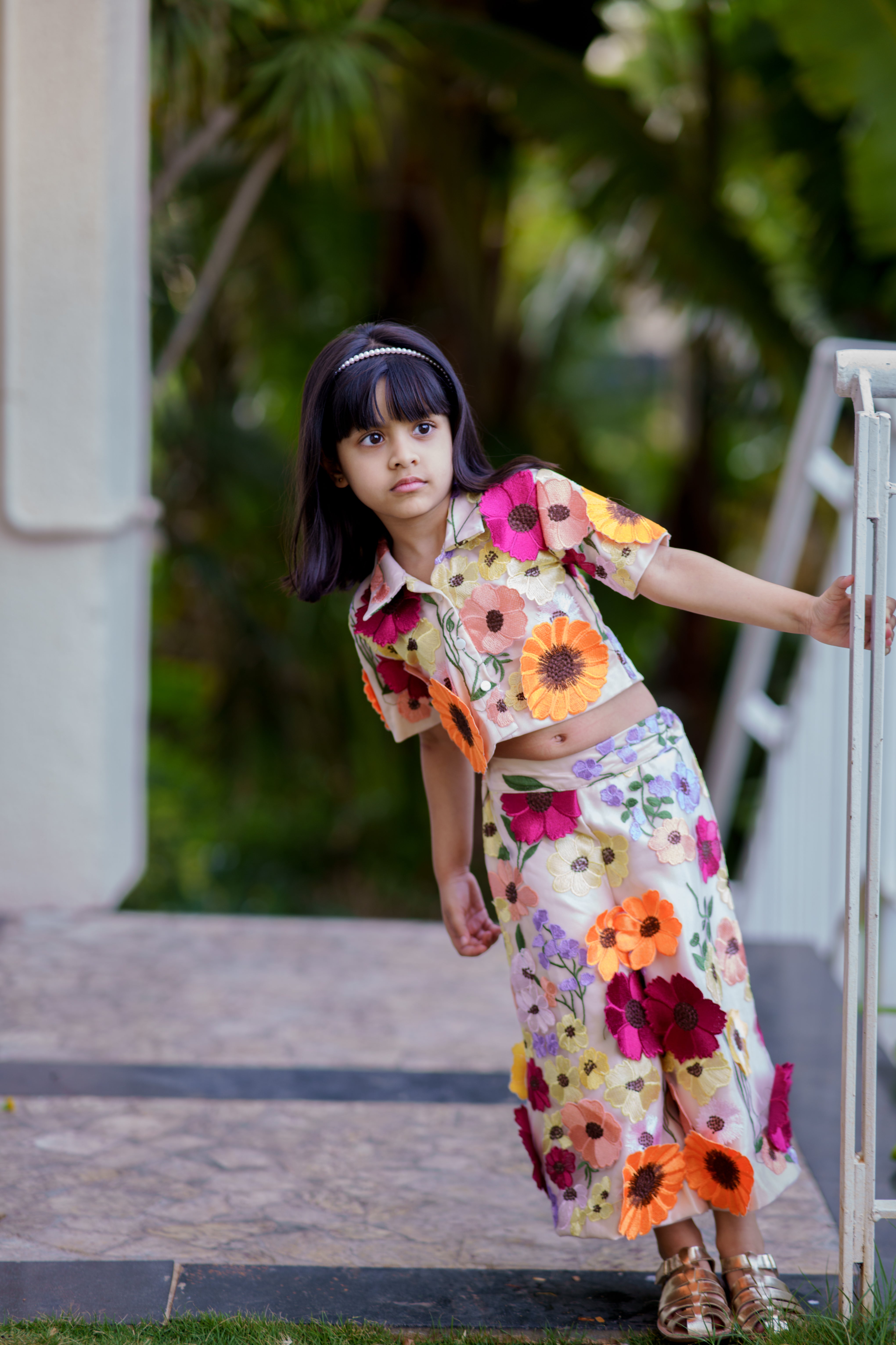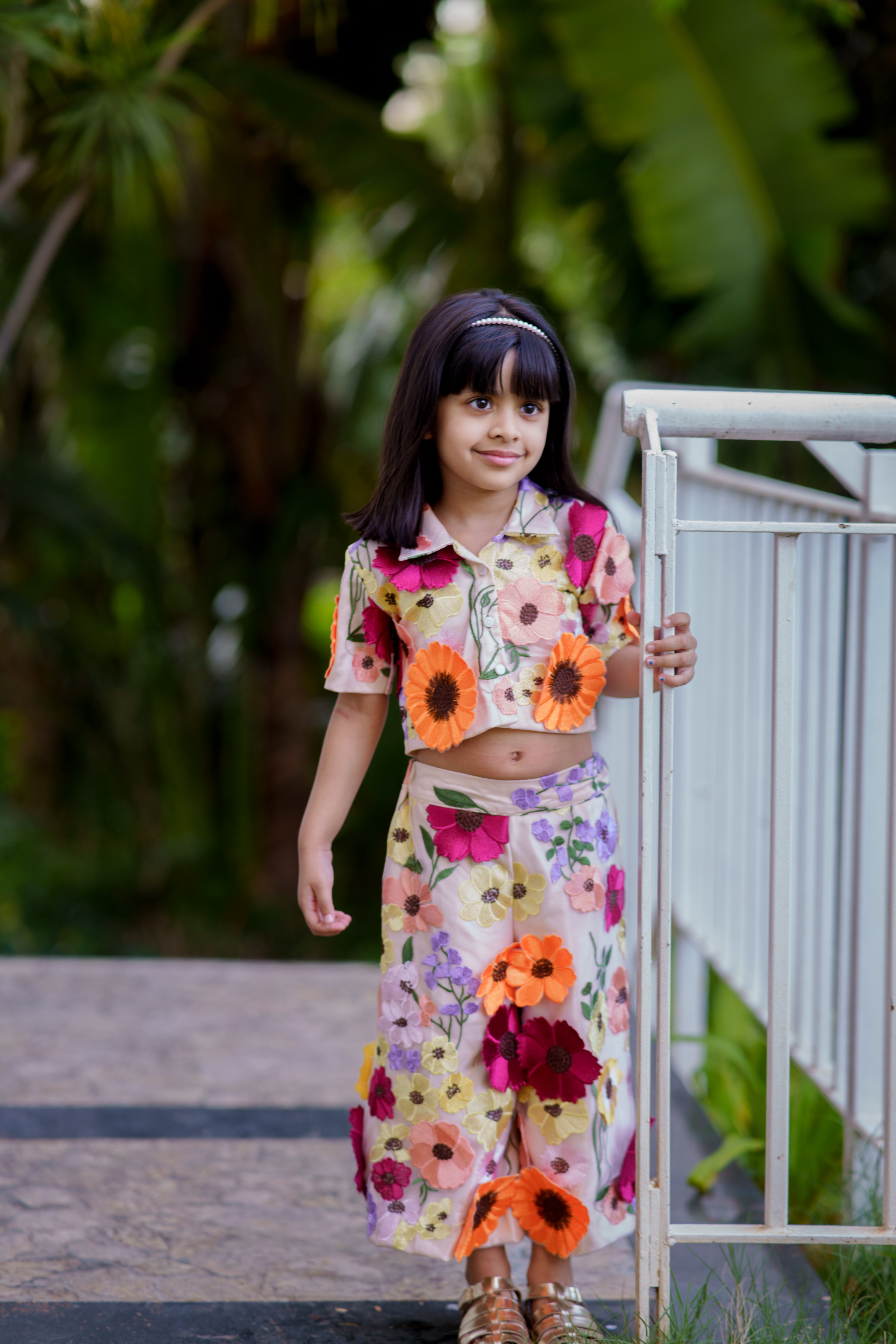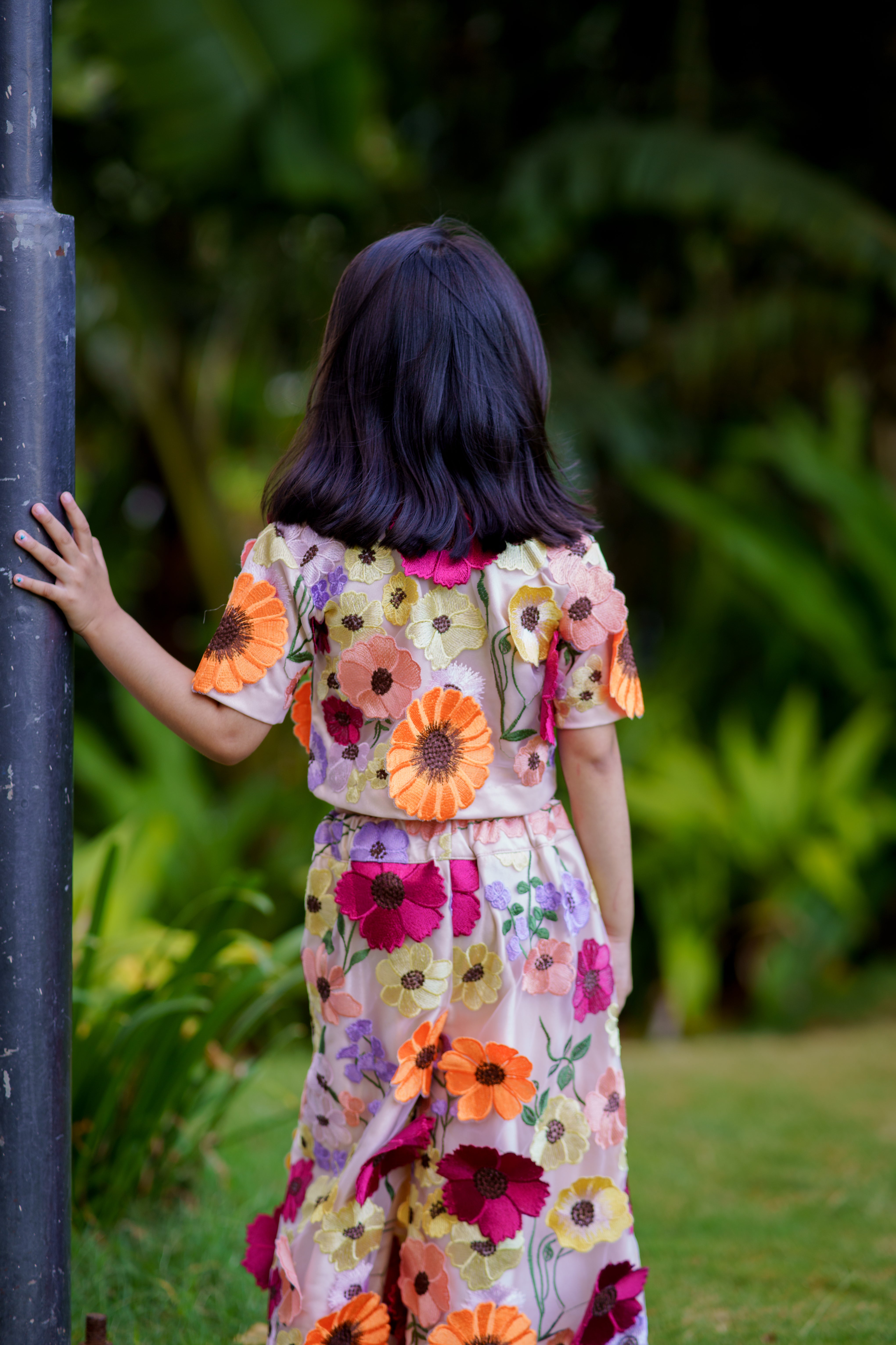 Crafted for the spotlight. This vibrant co-ord set features a cropped net top and wide-leg pants, both adorned with a riot of colorful 3D flowers. Designed to turn heads, the set is lined with soft satin for a comfortable feel against the skin. Bold, playful, and perfect for special occasions — this outfit is made for little fashion icons.