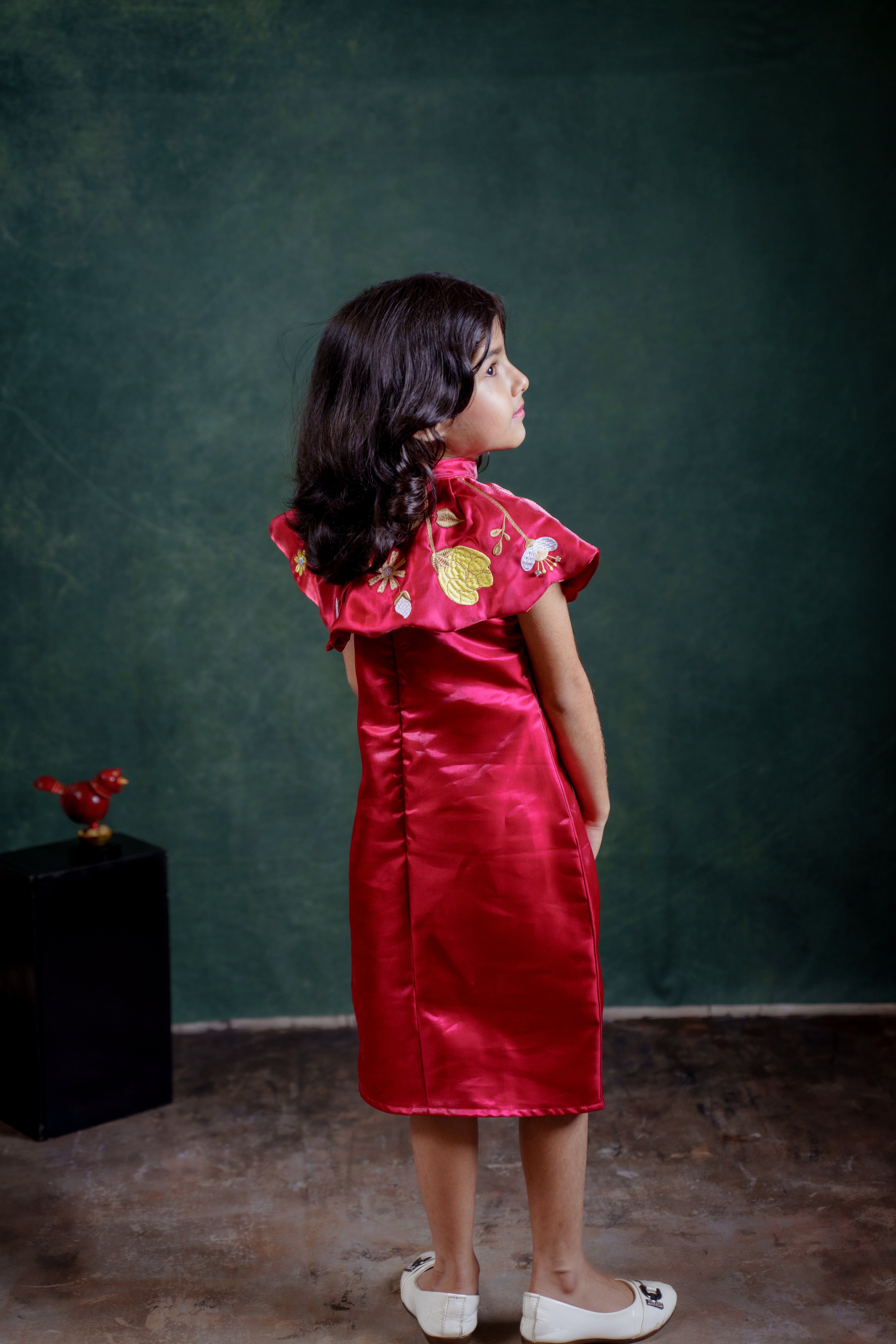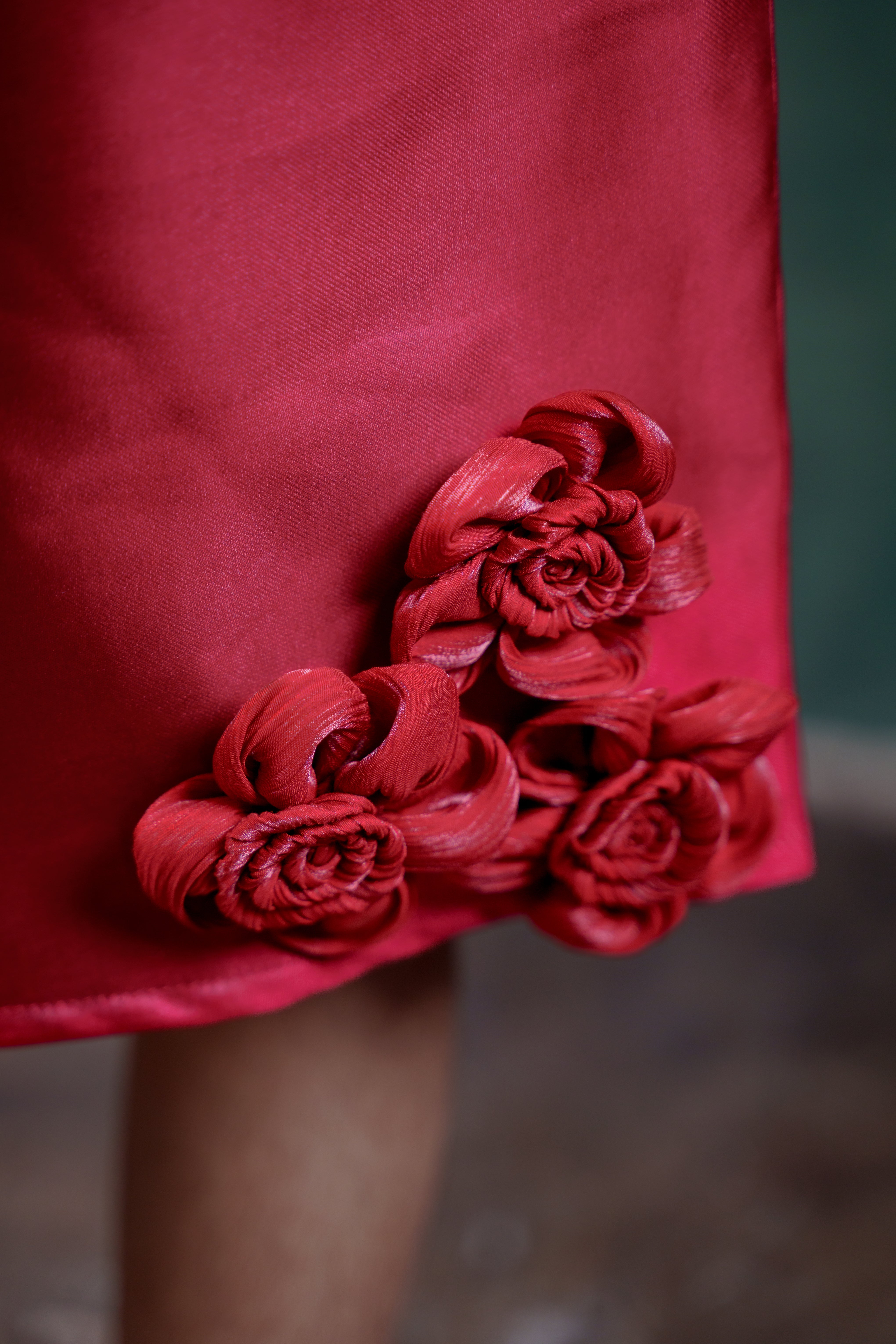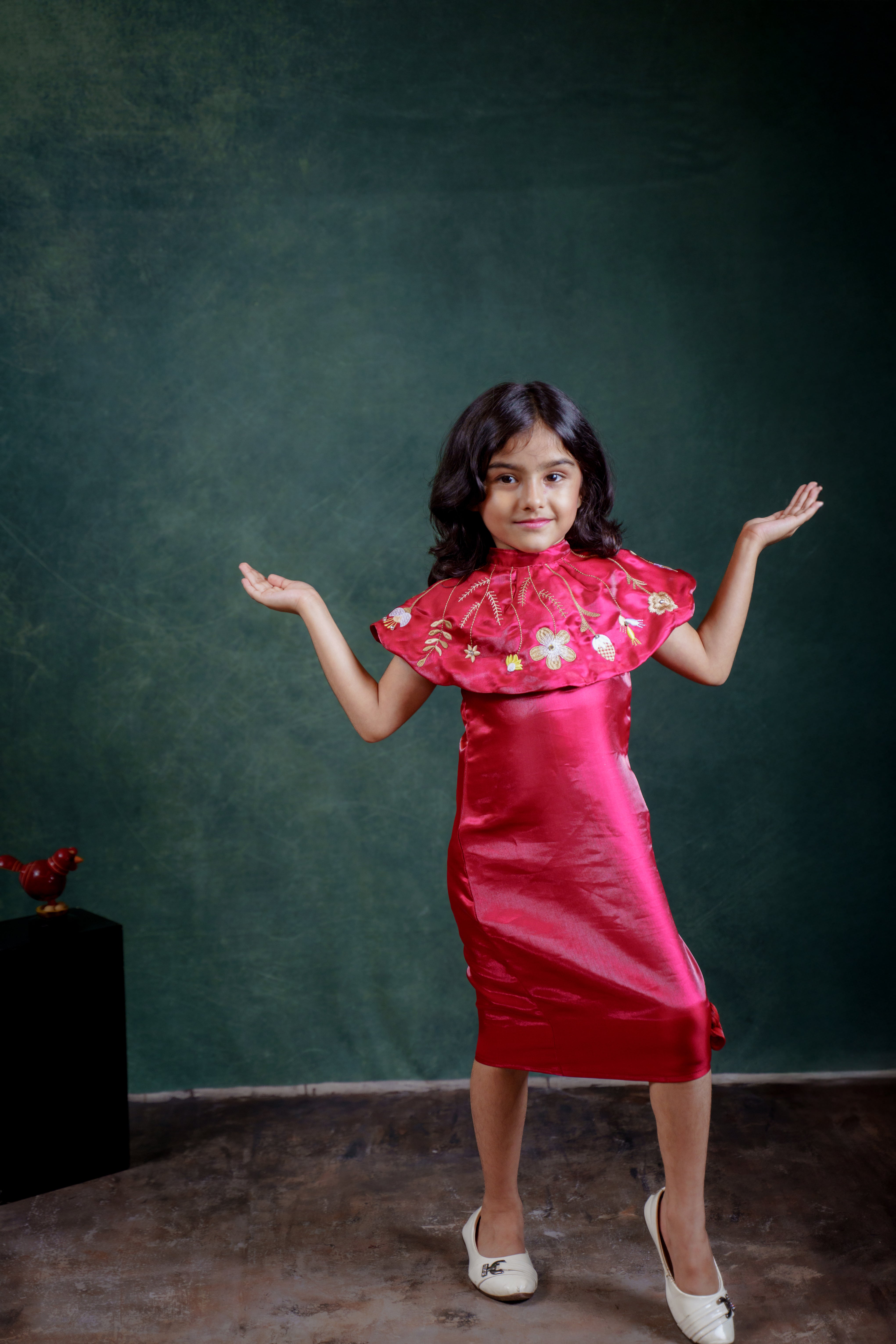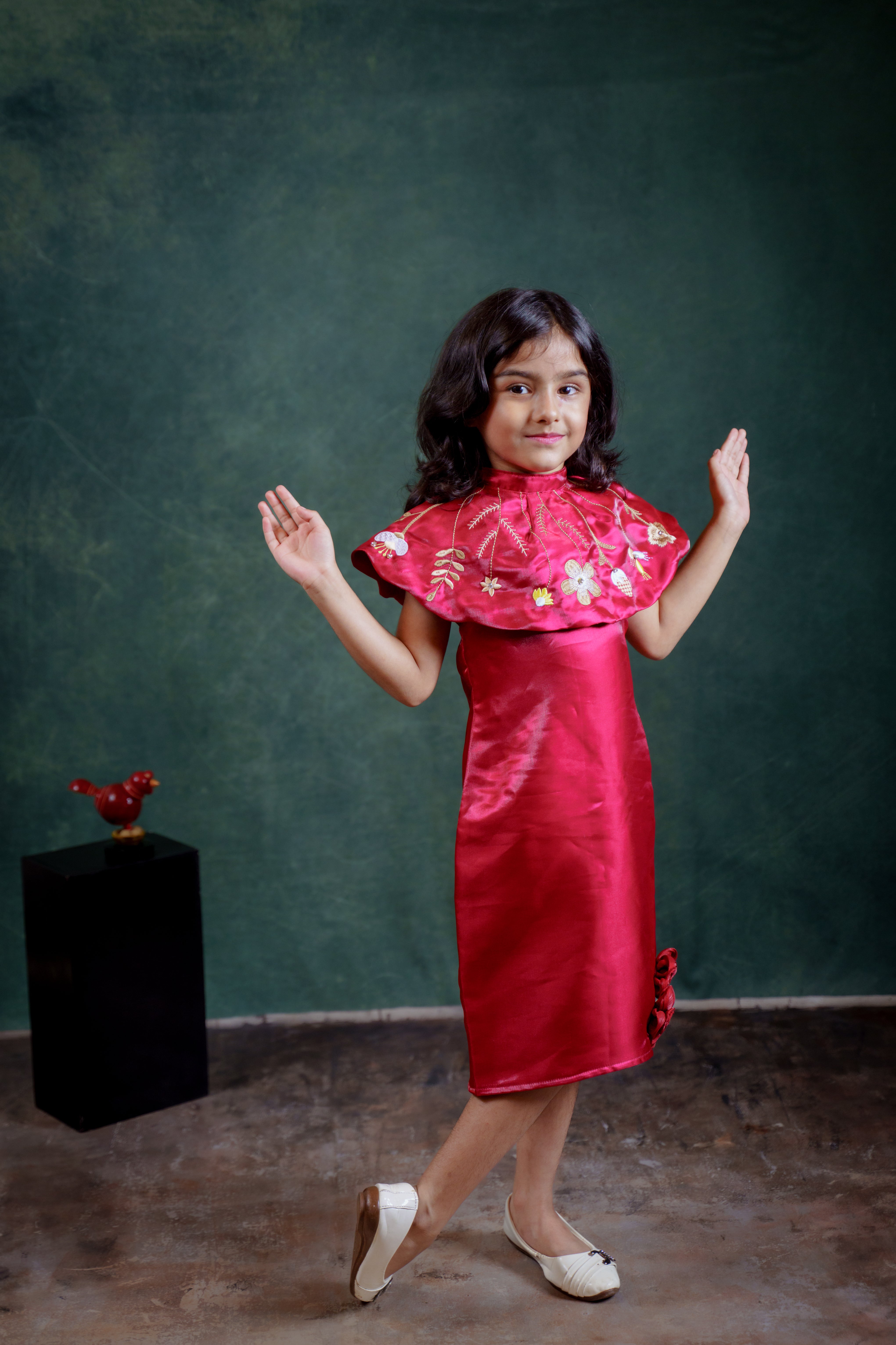 The red riding hood dress is a statement piece in luxurious satin, this striking red dress is designed to make your little diva shine. It features delicate floral detailing at the hem and comes with a removable embroidered cape, adorned with blooming flower motifs. The silhouette is sleek yet comfortable, offering a perfect balance of sophistication and charm ideal for special occasions and runway moments alike.