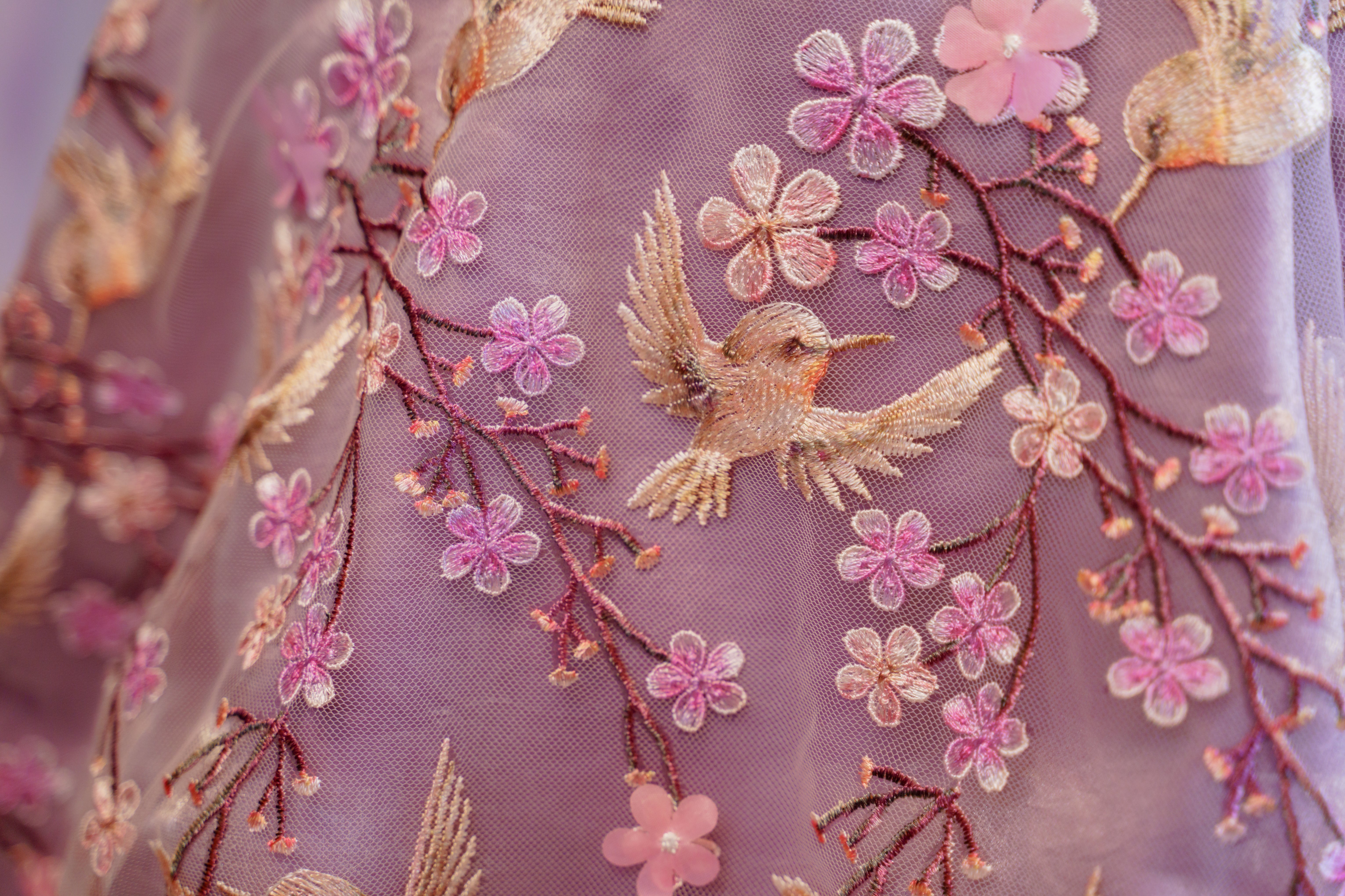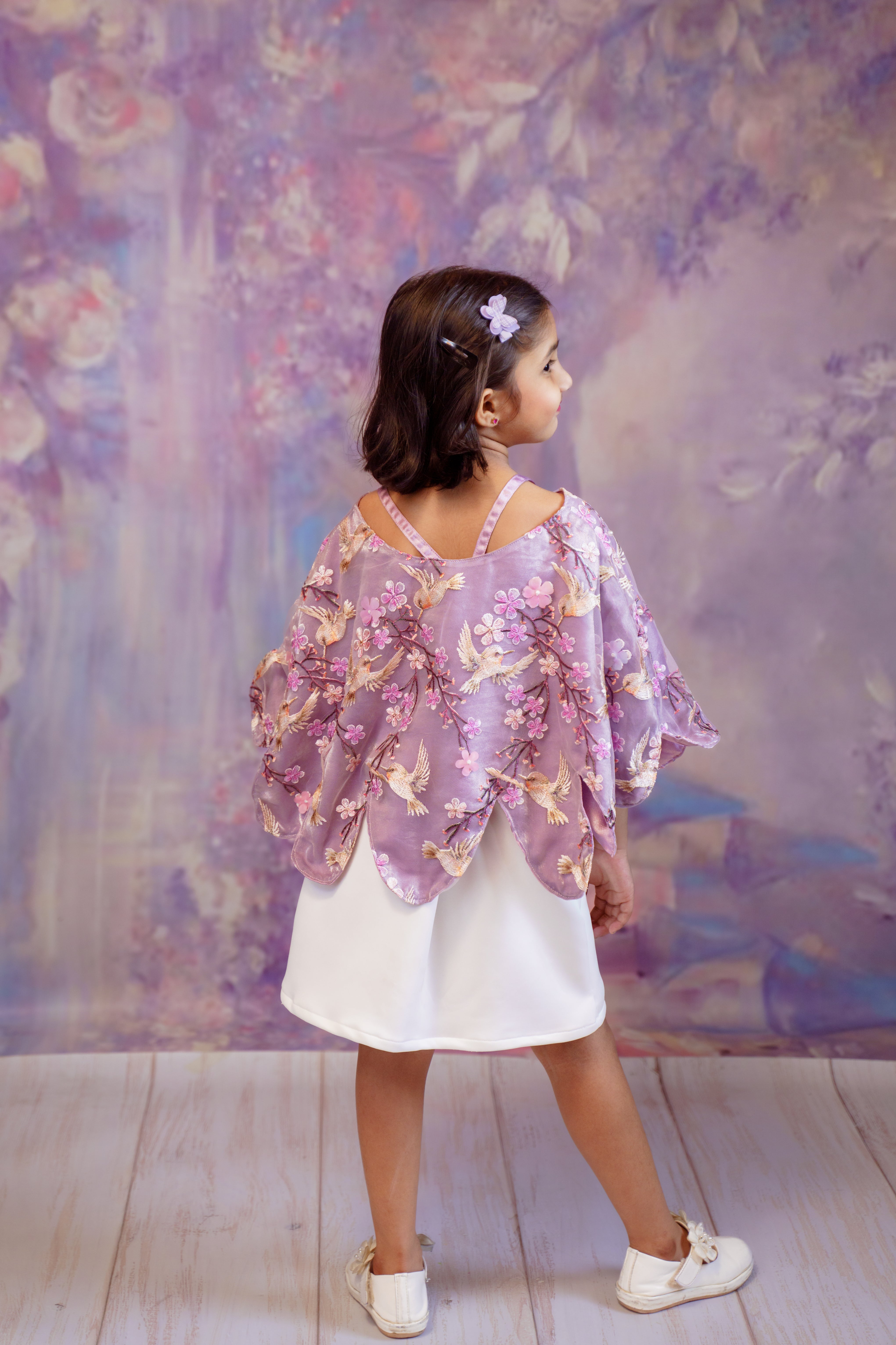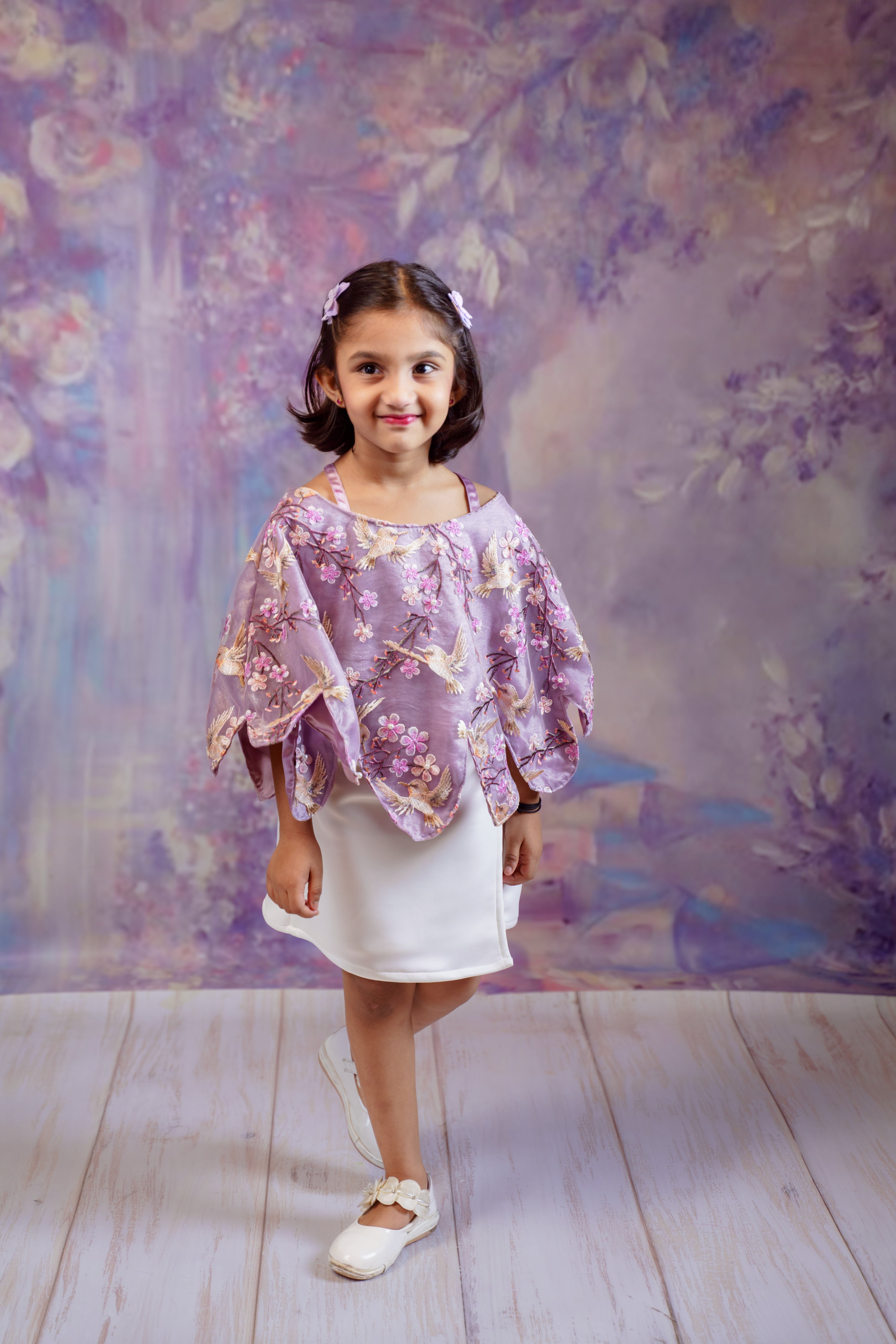 The Tweetie co-ord set feels like a story come to life. The lilac embroidered cape, shaped like soft petals, features birds in flight and blooming florals, adding a dreamy, fairy-garden touch. Paired with a classic white cotton skirt in a clean A-line silhouette, brings together grace and playfulness in perfect harmony. Designed for little divas who love to twirl, explore, and shine with effortless elegance.